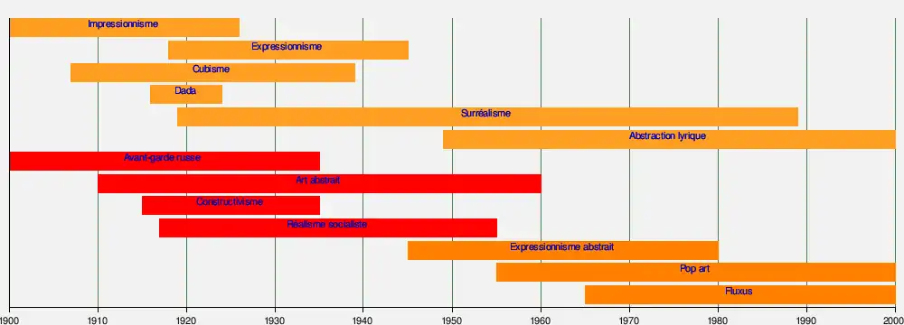 La frise suivante présente les périodes d'expression prédominante des différents mouvements artistiques apparus en Europe (orange), en Asie (jaune), au Moyen-Orient (vert), en Russie (rouge) et aux États-Unis (orange sombre) :