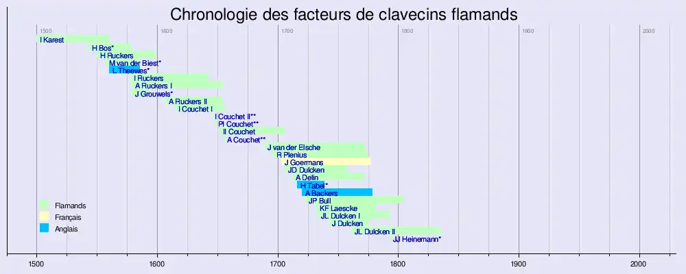 Chronologie plus détaillé des facteurs de clavecins flamands, intégrant les émigrés réputés ayant exercé dans d'autres régions.
