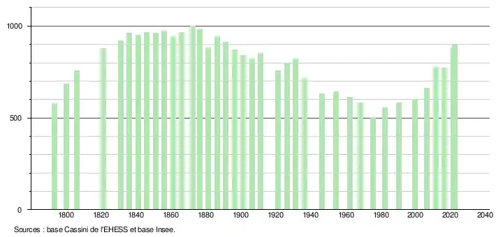 L'évolution du nombre d'habitants est connue à travers les recensements de la population effectués dans la commune depuis 1793. Pour les communes de moins de 10 000 habitants, une enquête de recensement portant sur toute la population est réalisée tous les cinq ans, les populations de référence des années intermédiaires étant quant à elles estimées par interpolation ou extrapolation[18]. Pour la commune, le premier recensement exhaustif entrant dans le cadre du nouveau dispositif a été réalisé en 2006[19].