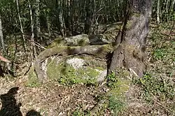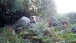 Dolmen en ruine avec sa table brisée d'environ 8 mètres de circonférence[27].