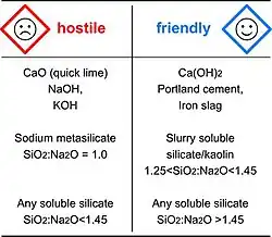Le tableau dresse la liste des produits chimiques alcalins et leur étiquette de danger correspondante[8]. Les produits corrosifs doivent être manipulés avec des gants, des lunettes et des masques. Ils sont hostiles à l'utilisateur et ne peuvent pas être mis en œuvre dans des applications de masse sans respecter les procédures de sécurité appropriées. Dans la deuxième catégorie, on trouve le ciment Portland ou la chaux hydratée, produits typiques de masse. Les réactifs alcalins géopolymères appartenant à cette classe peuvent aussi être appelés inoffensifs (user-friendly).