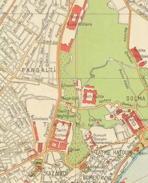 Les bâtiments actuellement de l'autre côté de l'avenue Cumhurriyet sont le lycée français Notre-Dame de Sion au nord et l'hôpital Surp-Agop au sud.