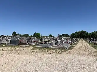 Le cimetière se trouvait à l'origine sur le terre-plein immédiatement au sud de l'église Notre-Dame. Devenu bien trop exigu pour la population d'alors, il fut déplacé au nord du village en 1858 et les tombes anciennes transférées en 1875 ; il forme un quadrilatère[2]. On y accède par un portail de fer forgé sous un grand arc de pierre. Le cimetière se trouve dans les champs à la sortie du village.