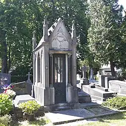 Ce monument est l’un des rares du cimetière à s’apparenter à un style néogothique. Il est réalisé en granit fin. Il adopte la forme d’une chapelle funéraire[25] dont les ouvertures sont enrichies de trois vitraux colorés. Le choix du néogothique témoigne d’une certaine appartenance au monde catholique.