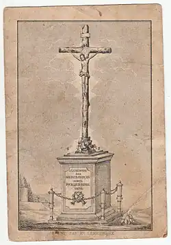 Le monument était initialement prévu pour être placé au rond-point de l'entrée du cimetière. Mais la maquette fait très bonne impression et la Ville, dépourvue de monument à cette époque, souhaite un emplacement plus visible. C'est en face de l'Athénée que le Conseil communal choisi de l'implanter. Les travaux sont en cours quand ce projet est abandonné à la demande d'Auguste Gérard, ministre plénipotentiaire de la République française en Belgique. Celui-ci estime que c'est bien au cimetière que le monument doit être élevé. Valère Mabille indemnise la Ville des travaux entrepris[24].
