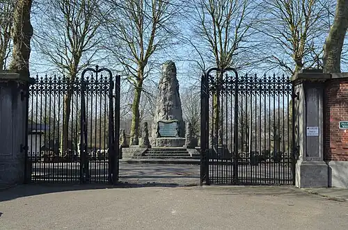 - ↑ Dédicace du monument : « Monument élevé à la mémoire des soldats français morts à Charleroi en 1870, au nom de la colonie française, par Monsieur Valère Mabille, président de la chambre de commerce française, président de la société française de bienfaisance. »