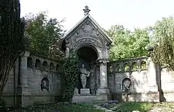 En 1914, le propriétaire de l'entreprise Ferdinand Warburg fait construire une sépulture héréditaire monumentale à proximité de la chapelle, dans l'angle d'un mur ouest et sud. Le coût d’achat du lieu de sépulture à lui seul représente plus de dix fois le revenu annuel d’un ouvrier de l’époque. Le style de l'ensemble reprend également les formes romanes de la chapelle. Dans l'angle des murs se trouve un faux portail en diagonale, en forme d'édicule, richement décoré, auquel mène un petit escalier. Le ciel qui attend le défunt derrière le portail est représenté en mosaïque de verre bleu avec un cadre doré. Dans le portail se trouve une sculpture en marbre représentant une personne en deuil vêtue d'habits anciens avec une lyre, créée par Hans Dammann. La première version de cette sculpture a dû être complètement remplacée car Warburg n'aime pas les veines de marbre sur le visage de la sculpture[8]