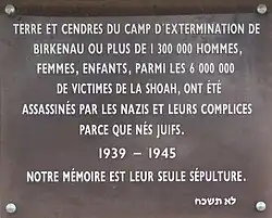 « Terre et cendres du camp d'extermination de Birkenau ou plus de 1 300 000 hommes, femmes, enfants parmi les 6 000 000 de victimes de la Shoah, ont été assassinés par les nazis et leurs complices, parce que nés Juifs.