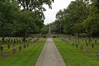 L'entrée se fait par une porte étroite dans un petit bâtiment brut et massif en granit noir, en partie noyée dans des massifs de fleurs. Le cimetière est un alignement de tombes marqué par une croix de granit sur laquelle sont uniquement indiqués le grade, nom, prénom, date de naissance et de décès d'un ou de deux soldats. Au centre, se trouve une grande croix de 5 mètres de haut reposant sur un socle circulaire sur lequel sont disposées des plaques de bronze portant les noms de 4 019 soldats. Sous la croix se trouve une fosse commune avec plus de 800 soldats allemands inconnus.