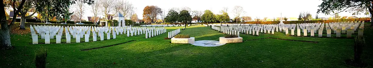 À travers les arcades du bâtiment de l’entrée, on aperçoit au bout de l’allée centrale la célèbre Croix du Sacrifice (sur sa base octogonale). Elle a été désignée par l'architecte britannique Sir Reginald Blomfield (1856-1942), et elle orne de nombreux mémoriaux britanniques.