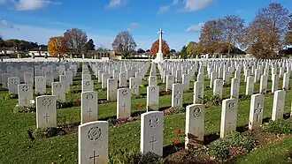 À travers les arcades du bâtiment de l’entrée, on aperçoit au centre du cimetière la célèbre Croix du Sacrifice (sur sa base octogonale). Elle a été dessinée par l'architecte britannique Sir Reginald Blomfield (1856-1942), et elle orne de nombreux mémoriaux britanniques.