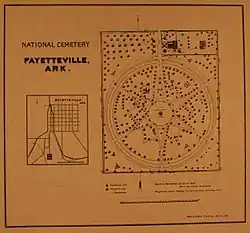 La parcelle d'origine de 6 acres ( Unité « » inconnue du modèle {{Conversion}}.) de terrain pour le cimetière national est achetée en 1867 auprès du juge David Walker et Stephen Stone[2], des noms aussi associés à la maison historique Walker-Stone à Fayetteville. Le plan original est un cercle extérieur autour d'une étoile à six branches avec des diamants entre les points de l'étoile et un mât de drapeau au centre. Il y a dix-huit sections, avec une capacité estimée de 1 800 tombes[3]. Les premières inhumations sont des corps déplacés des cimetières des champs de bataille de la bataille de Prairie Grove et de la bataille de Pea Ridge. En 1871, il y a 1 200 inhumations dans le cimetière, dont la plupart sont non-identifiées.