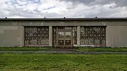 Dans une mise en scène théâtrale, Charles Halley propose un portique encadré par deux portes monumentales de 10 mètres de haut et près de 5 mètres de large dans un aspect digne et solennel. Le béton armé utilisé est dissimulé sous un parement en pierre de Villebois, à l'exception de l'entablement à frises d'ondulation en béton brut. Deux vantaux coulissant dans la maçonnerie composent chacune des portes monumentales. Ces vantaux sont des grilles ouvragées en fonte, ornés de motifs géométriques simples qui renvoient aux motifs des grilles du pavillon de la conservation et des clôtures.