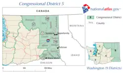 Le 5e district congressionnel de Washington englobe les comtés de l'est de l'État de Washington, de Ferry, Stevens, Pend Oreille, Lincoln, Spokane, Whitman, Walla Walla, Columbia, Garfield et Asotin, ainsi que des parties d'Adams et Franklin. Elle est centrée sur Spokane, la deuxième plus grande ville de l'État.