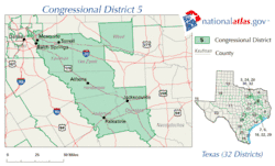 Le 5e district congressionnel du Texas se trouve dans une zone qui comprend une partie nord-est de la ville de Dallas, le Comté de Dallas, y compris Mesquite, ainsi qu'un certain nombre de petits comtés de banlieue, exurbains et ruraux au sud et à l'est de Dallas, dont Anderson, Cherokee, Henderson, Van Zandt et Kaufman. Au recensement de 2000, le 5e district représente 651 620 habitants.