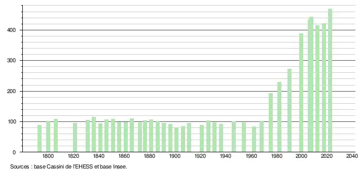 L'évolution du nombre d'habitants est connue à travers les recensements de la population effectués dans la commune depuis 1793. Pour les communes de moins de 10 000 habitants, une enquête de recensement portant sur toute la population est réalisée tous les cinq ans, les populations de référence des années intermédiaires étant quant à elles estimées par interpolation ou extrapolation[21]. Pour la commune, le premier recensement exhaustif entrant dans le cadre du nouveau dispositif a été réalisé en 2007[22].