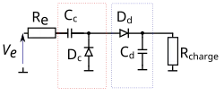 Un circuit de clamp (en) (cadre rouge dans le schéma) ajoute la tension nécessaire pour avoir un signal toujours positif : le circuit devient alors un doubleur de tension.