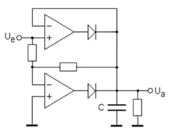 Quand le signal n'est pas symétrique, et qu'on veut en extraire la valeur de crête à crête, il faut redresser les deux alternances. Cela peut s'effectuer, soit par un circuit à diodes, soit par un circuit à amplificateurs opérationnels.