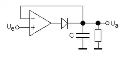 L'amplificateur opérationnel bouclé sur lui-même compense la différence entre ses deux bornes d'entrée (+ et -). En anglais ce montage est dénommé peak detector[8].