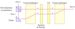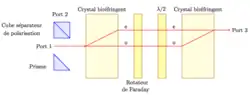 - Du port 3 vers le port 2: La lumière venant du port 3 vient heurter un premier cristal biréfringent qui sépare le faisceau en deux faisceaux polarisés respectivement ordinaire et extraordinaire. La succession de la lame demi-onde et du rotateur de Faraday vient doubler l'écartement entre les deux faisceaux. Ceci est rendu possible dans un sens de propagation (et pas l'autre) car le rotateur de Faraday n'est pas réciproque. Le faisceau polarisé ordinaire vient heurter le cube séparateur de polarisation tandis que le faisceau extraordinaire vient simplement se réfléchir contre un prisme[3].