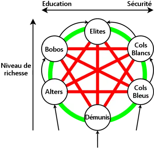 Les Alters apprécient les cultures Bobo et Démuni, ont de mauvaises relations avec les Cols Bleus et Élites mais détestent absolument les Cols Blancs.