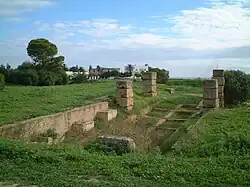 Les auteurs anciens ont longuement évoqué les murailles des cités puniques à l'occasion de la relation des sièges subis par certaines d'entre elles[29]. Outre les citadelles des cités principales existaient également des forteresses destinées au contrôle d'un territoire donné[30]. Les fouilles archéologiques ont largement confirmé la diffusion dans tout l'espace punique du modèle de la ville avec enceinte fortifiée, du moins dans l'état actuel des recherches[30]. Les fouilles du quartier Magon de Carthage ont mis en évidence le tracé de la muraille de la cité, au travers de laquelle une porte était percée, du côté de la mer.