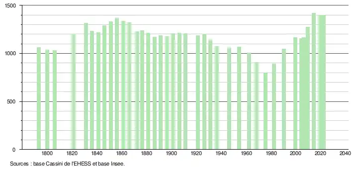 L'évolution du nombre d'habitants est connue à travers les recensements de la population effectués dans la commune depuis 1793. Pour les communes de moins de 10 000 habitants, une enquête de recensement portant sur toute la population est réalisée tous les cinq ans, les populations de référence des années intermédiaires étant quant à elles estimées par interpolation ou extrapolation[29]. Pour la commune, le premier recensement exhaustif entrant dans le cadre du nouveau dispositif a été réalisé en 2004[30].