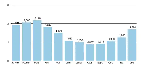 Le débit fluctue peu dans l'année. On distingue cependant une période de hautes eaux de janvier à avril avec des moyennes mensuelles de 1,68 à 2,17 m3/s (maximum en mars). Dès avril, le débit diminue jusqu'au basses eaux d'été-automne de juin à octobre avec une baisse du débit moyen mensuel jusqu'à 0,887 m3/s en août, ce qui reste abondant. D'octobre à janvier, la débit progresse. Ces moyennes mensuelles ne sont pas exemptes de fluctuations plus prononcées sur courtes périodes.