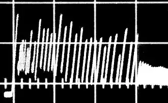 Ceci est illustré par l'oscillogramme ci-contre. Un condensateur est monté en parallèle sur une charge inductive. Quand on ouvre le circuit, le courant de l'inductance charge le condensateur au-delà de sa tension de claquage. On peut alors voir des oscillations de relaxations. Chaque chute de tension est due à un claquage. Après quelques dizaines d'oscillations, le condensateur n'arrive plus à s'autocicatriser, il est définitivement détruit.