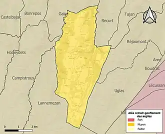 Le retrait-gonflement des sols argileux est susceptible d'engendrer des dommages importants aux bâtiments en cas d’alternance de périodes de sécheresse et de pluie. La totalité de la commune est en aléa moyen ou fort (44,5 % au niveau départemental et 48,5 % au niveau national). Sur les 243 bâtiments dénombrés sur la commune en 2019, 243 sont en aléa moyen ou fort, soit 100 %, à comparer aux 75 % au niveau départemental et 54 % au niveau national. Une cartographie de l'exposition du territoire national au retrait gonflement des sols argileux est disponible sur le site du BRGM[19],[Carte 2].