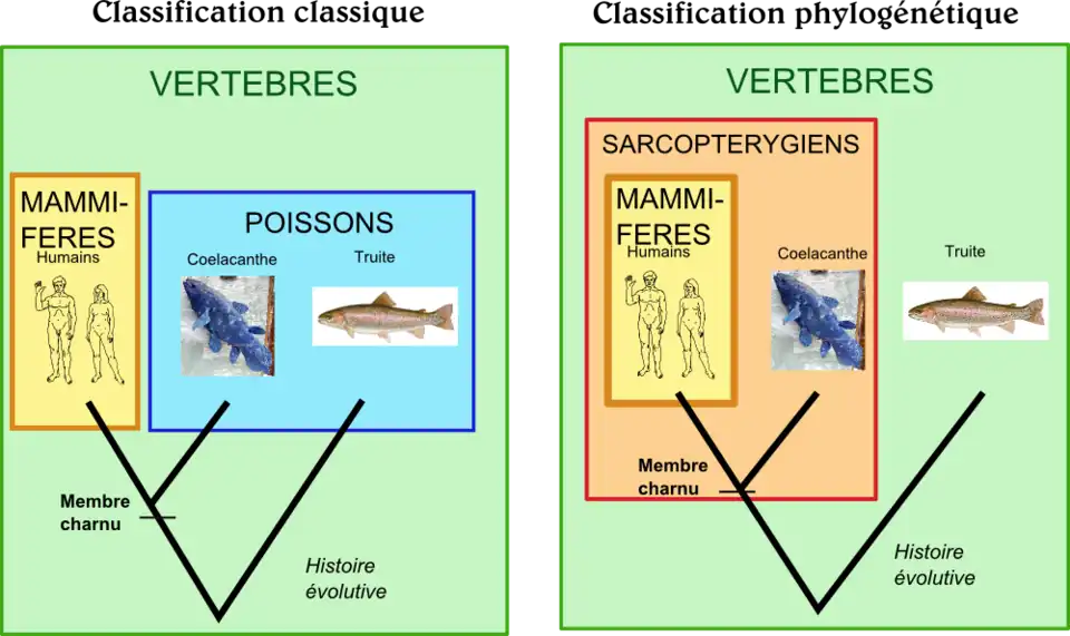 Les classifications traditionnelles n'ont pas toujours eu pour objectif de retracer la parenté et l'évolution des espèces. Il existait des classifications scientifiques dans un contexte pré-évolutionniste[19]. Or, selon cette classification, on peut être amené à penser qu'un poisson sera toujours plus proche d'un autre poisson que d'une autre espèce non poisson. Cela n'est en fait pas toujours vrai. En effet, les poissons sont caractérisés par des écailles et des nageoires. Or les humains partagent avec certaines espèces de poissons, comme les Cœlacanthes, un autre caractère : le membre charnu et non rayonné. Ce dernier caractère n'est pas présent chez la truite par exemple. Le cœlacanthe est-il plus proche de l'humain ou de la truite ? Faut-il utiliser pour établir la parenté la plus étroite, le membre charnu ou la présence de nageoires ?
