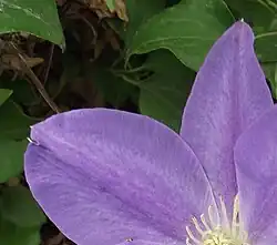 Les sépales de la clématite Diana's Delight mesurent entre 6 et 8 cm de long. Ils sont ondulés et striés le long de la nervure centrale.