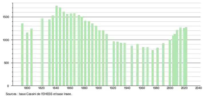 L'évolution du nombre d'habitants est connue à travers les recensements de la population effectués dans la commune depuis 1793. Pour les communes de moins de 10 000 habitants, une enquête de recensement portant sur toute la population est réalisée tous les cinq ans, les populations de référence des années intermédiaires étant quant à elles estimées par interpolation ou extrapolation[24]. Pour la commune, le premier recensement exhaustif entrant dans le cadre du nouveau dispositif a été réalisé en 2004[25].