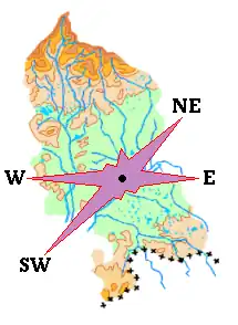 La petite carte ci-contre montre les directions de l'origine des vents dominants dans la Trouée de Belfort. On voit nettement l'influence des massifs montagneux, Vosges (au nord) et Jura (au sud), qui forment les murs d'un couloir reliant la vallée du Rhin et la plaine d'Alsace au bassin de la Saône.