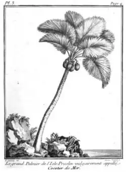 Peu de temps après, le botaniste voyageur, Pierre Sonnerat, parti de l'Isle de France (île Maurice) comme « écrivain de vaisseau » pour une expédition de onze mois (de 1771 à 1772) pour chercher des épices aux Philippines et aux Moluques, fait une escale à l'île de Praslin où il s'émerveille sur le coco de mer. Il consacrera d'ailleurs le premier chapitre de son récit de Voyage à la Nouvelle Guinée publiée en 1776, à une description précise du « grand palmier de l'Isle Praslin », de ses fleurs et fruits, le tout bien illustré de plusieurs gravures[3]. Avant cette publication, il avait lu une description botanique de ce palmier lors d'une séance de l'Académie (en 1773).