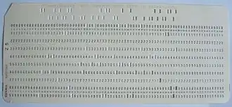 - Chaque perforation de chiffre 0 à 9 des cartes perforées précédentes devenait codée en décimal codé binaire (DCB/BCD), il s'agit des lignes de bits 1, 2, 4 et 8 sur la carte, offrant 10 valeurs.