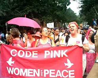 Code Pink: Women for Peace (« Code Rose : Femmes pour la paix ») est un groupe anti-guerre international. Ce groupe a commencé à se faire connaître en affichant son opposition à la guerre d'Irak. Sa signature visuelle est la couleur rose. Le groupe a mené des marches et des manifestations pacifiques.
