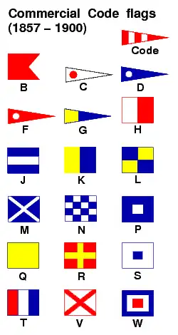 Le Code international des signaux a été précédé par une variété de signaux navals et de signaux privés, notamment le Code Marryat, les drapeaux de code les plus largement utilisés avant 1857. L'actuel Code international des signaux a été rédigé en 1855 par la Commission du Commerce britannique et publié en 1857 sous le nom de Code de commerce. Il se composait de deux parties : la première contenant des signaux universels et internationaux et la seconde des signaux britanniques uniquement. Dix-huit indicateurs de signal distincts (voir tableau) ont été utilisés pour créer plus de 70 000 messages possibles. Les voyelles ont été omises de l'ensemble afin d'éviter d'épeler un mot qui pourrait être répréhensible dans n'importe quelle langue, comme certaines lettres peu utilisées. La Commission l'a révisé en 1887 avant d'être modifié à la Conférence internationale de 1889 à Washington, DC[3]. Le nouveau code international des signaux est officiellement entré en vigueur dans le monde entier le 1er janvier 1901. Initialement, le code fut utilisé en même temps que l'ancien système jusqu'au 1er janvier 1902, puis utilisé exclusivement après le 1er janvier 1903. Dans cette nouvelle édition, le nombre de drapeaux passa de 18 et un fanion de code, à 26 et un fanion de code. Les huit nouveaux drapeaux représentaient les voyelles AEIOU et les lettres XYZ[4].