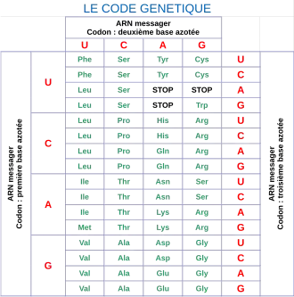 La correspondance entre codons d'ARN messager et acides aminés protéinogènes est généralement présentée sous forme de tableaux associant chacun des 64 codons, ou triplets de quatre bases nucléiques possibles (43 = 64), avec l'un des 22 acides aminés protéinogènes.