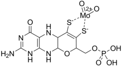 Un cofacteur à molybdène, parfois abrégé en MoCo, est un cofacteur nécessaire à l'activité de certaines enzymes telles que la xanthine oxydase, la DMSO réductase, la sulfite oxydase, la nitrate réductase, l'éthylbenzène hydroxylase, la glycéraldéhyde-3-phosphate déshydrogénase à ferrédoxine et l'arséniate réductase à glutarédoxine[2],[3]. Chimiquement, de tels cofacteurs résultent de la formation d'un complexe entre un oxyde de molybdène et une molécule de molybdoptérine, ou un dérivé — parfois assez éloigné — de molybdoptérine.