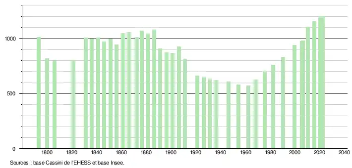 L'évolution du nombre d'habitants est connue à travers les recensements de la population effectués dans la commune depuis 1793. Pour les communes de moins de 10 000 habitants, une enquête de recensement portant sur toute la population est réalisée tous les cinq ans, les populations de référence des années intermédiaires étant quant à elles estimées par interpolation ou extrapolation[15]. Pour la commune, le premier recensement exhaustif entrant dans le cadre du nouveau dispositif a été réalisé en 2005[16].