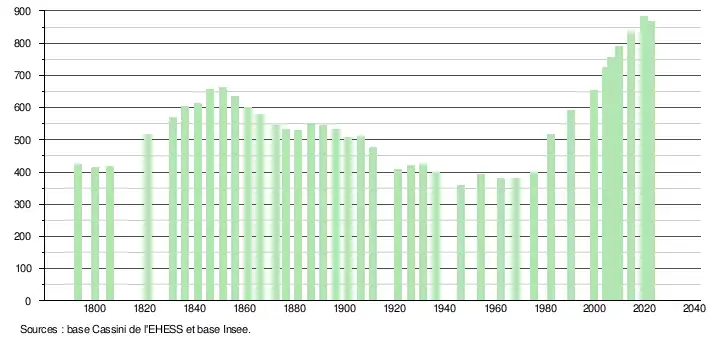 L'évolution du nombre d'habitants est connue à travers les recensements de la population effectués dans la commune depuis 1793. Pour les communes de moins de 10 000 habitants, une enquête de recensement portant sur toute la population est réalisée tous les cinq ans, les populations de référence des années intermédiaires étant quant à elles estimées par interpolation ou extrapolation[18]. Pour la commune, le premier recensement exhaustif entrant dans le cadre du nouveau dispositif a été réalisé en 2004[19].