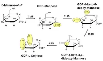 La biosynthèse du colitose commence avec ColE, une mannose-1-phosphate guanylyltransférase qui catalyse l'ajout d'un fragment GMP au mannose, produisant le GDP-mannose. Dans l'étape suivante, ColB, une enzyme déshydrogénase-réductase à chaîne courte dépendante du NADP, catalyse l'oxydation en C-4 et l'élimination du groupe hydroxyle en C-6. Le produit résultant, GDP-4-keto-6-deoxymannose, réagit ensuite avec l'enzyme dépendante du PLP GDP-4-keto-6-deoxymannose-3-dehydratase (ColD), qui élimine l'hydroxyle en C-3 d'une manière similaire à celle de la sérine déshydratase. Dans la dernière étape, le produit de ColD, GDP-4-keto-3,6-didésoxymannose, réagit avec ColC, ce qui réduit la fonctionnalité cétone en C-4 en un alcool et inverse la configuration autour de C-5[6].