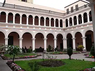 L’église du collège Saint-Paul – aujourd’hui appelée ‘basilique Saint-Pierre’ – fut inaugurée en 1638. Le maître d’œuvre en est le frère Martin de Aizpitiarte d’après les plans du père Nicolas Duron Mastrilli, premier recteur du collège quand celui-ci devint ‘université’. Elle résista à plusieurs tremblements de terre. Sa cloche ‘Agustina’ (populairement appelée ‘Grand-Mère’) est la plus ancienne de Lima. C’est dans cette église, joyau du baroque péruvien, (alors ‘église Saint-Paul') que le vénérable Francisco del Castillo prononça pour la première fois ce que l’on appelle le ‘Sermon de trois heures’ (durant la semaine sainte de 1655) car son commentaire des sept paroles de Jésus en croix dura trois heures... !