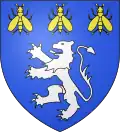 Blason de Gilles Albert Denis Doyen de la Collégiale d'Avesnes-sur-Helpe : D'azur au lion d'argent surmonté de trois abeilles d'or rangé en chef |