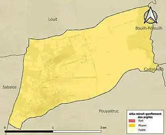 Le retrait-gonflement des sols argileux est susceptible d'engendrer des dommages importants aux bâtiments en cas d’alternance de périodes de sécheresse et de pluie. La totalité de la commune est en aléa moyen ou fort (44,5 % au niveau départemental et 48,5 % au niveau national). Sur les 70 bâtiments dénombrés sur la commune en 2019, 70 sont en aléa moyen ou fort, soit 100 %, à comparer aux 75 % au niveau départemental et 54 % au niveau national. Une cartographie de l'exposition du territoire national au retrait gonflement des sols argileux est disponible sur le site du BRGM[20],[Carte 3].