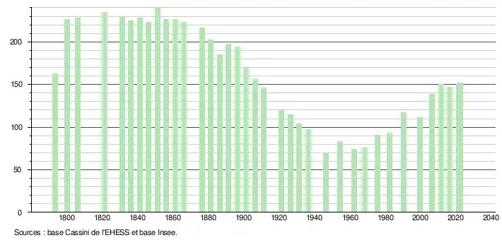 | L'évolution du nombre d'habitants est connue à travers les recensements de la population effectués dans la commune depuis 1793. Pour les communes de moins de 10 000 habitants, une enquête de recensement portant sur toute la population est réalisée tous les cinq ans, les populations de référence des années intermédiaires étant quant à elles estimées par interpolation ou extrapolation[27]. Pour la commune, le premier recensement exhaustif entrant dans le cadre du nouveau dispositif a été réalisé en 2006[28]. En 2022, la commune comptait 152 habitants[Note 3], en évolution de +3,4 % par rapport à 2016 (Hautes-Pyrénées : +1,59 %, France hors Mayotte : +2,11 %). |
