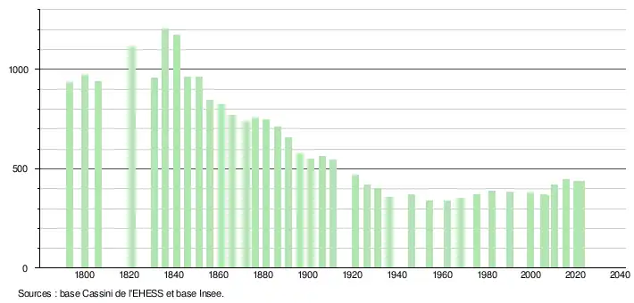 L'évolution du nombre d'habitants est connue à travers les recensements de la population effectués dans la commune depuis 1793. Pour les communes de moins de 10 000 habitants, une enquête de recensement portant sur toute la population est réalisée tous les cinq ans, les populations de référence des années intermédiaires étant quant à elles estimées par interpolation ou extrapolation[21]. Pour la commune, le premier recensement exhaustif entrant dans le cadre du nouveau dispositif a été réalisé en 2005[22].