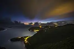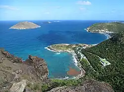 Saint-Barthélemy vue depuis l'île Forchue, avec Colombier au centre.