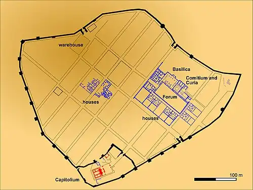 Cette disparité sensible entre les deux parties de la ville correspond la nature des édifices qu’elles accueillent. En effet, la partie nord de la ville semble affectée essentiellement à l’habitat, comme en témoignent les deux maisons fouillées de part et d’autre de la rue « M ». Il faut néanmoins signaler la présence d’un grenier à blé (horreum), au sud de la porte nord-ouest, ainsi que d’un possible petit temple qui lui fait pendant de l’autre côté de cette porte. La partie sud de la ville accueille quant à elle les principaux édifices publics de la ville, bien que le caractère circonscrit des fouilles ne permette pas de préciser la destination de tous ses îlots. Au sud-est se trouve le forum, centre institutionnel de la ville. Il se présente sous la forme d’une vaste place rectangulaire bordée sur trois de ses côtés par un portique continu. Le côté restant, au nord-est, est occupé par une série de bâtiments publics. Au nord se trouve une basilique, édifice rectangulaire servant de lieu de rassemblements, surtout pour les procès[2]. Au centre, la curie et le comitium, qui abritent respectivement les réunions du Sénat local et celles des assemblées populaires (les comices). Ce comitium se présente sous la forme de gradins aménagés en cercle, comme à Rome. Un temple rectangulaire et monté sur podium, dédié à la Concorde, est accolé à cet ensemble au sud[2]. Enfin, on reconnaît à l’angle sud-est un petit bâtiment rectangulaire correspondant vraisemblablement à la prison. Séparé du forum par un vaste îlot, le capitole est installé sur une éminence, dans l’angle sud-ouest de l’enceinte. Il s’agit du principal temple de la ville, dédié à la triade capitoline[2], c’est-à-dire aux trois dieux tutélaires de Rome : Jupiter, Junon et Minerve. De forme rectangulaire, ce temple comportait donc vraisemblablement une triple cella, correspondant aux trois divinités qui y étaient honorées. Un autre petit temple se trouve au nord-est du capitole. Notons que ce quartier présente une orientation discordante par rapport au reste de la ville, et qu’il est délimité par une enceinte interne.